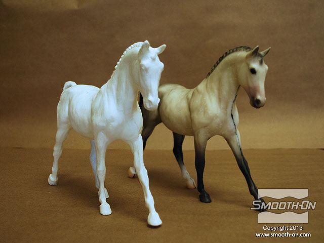 המודל המקורי הוא בעל מורכבות בינונית עם פרטים קטנים בעיקר באסור הרעמה ובפנים. המודל נבחן עבור בעיות אפשריות ונמצא שתנוחת הרגלים אינה אחידה כך שכל רגל נוגעת בלוח הבסיס בזווית אחרת. לאחר שהמודל יהיה מכוסה לחלוטין ב סיליקון לתבניות יהיה עליך לדעת היכן לבצע את החתך עבור חליצת המודל. לכן, מציירים שני קווים שיהיו רפרנס. את הקו הראשון מסמנים בעזרת טוש בתחתית הסוס, מהפה עד לקצה הזנב. בעזרת דבק חם, מייצבים את הסוס על גבי לוח הבסיס. כדי למנוע לכידה של בועות אוויר בזמן היציקה, יוצרים תעלות אוורור במקומות אסטרטגיים על המודל. במקרה זה, קיסמי עץ מודבקים אל המודל בקצה הזנב ובראש. את קו הסימון השני מציירים על לוח הבסיס לאורך המתווה של הקו שעל תחתית הסוס. יש להאריך את הקו לפחות 5 ס מודדים את המודל ומכינים תבנית בעזרת לוח מלאמין בעובי 1.9 ס לקופסת התבנית יש מרווח של לפחות 1.25 ס מדביקים את קופסת התבנית ללוח העץ בעזרת דבק חם. כך גם אוטמים את הקופסה לדליפה של גומי. מערבבים גומי סיליקון Mold Max® 30 ומכניסים למיכל ואקום כדי להוציא את בועות האוויר. שופכים לאט את סיליקון גמיש ליציקה Mold Max® 30 אל הנקודה הנמוכה בקופסת התבנית ומניחים לחומר לעלות בעצמו על המודל (בניגוד ללשפוך ישירות על המודל). ממלאים לחלוטין את קופסת התבנית ב סיליקון לתבניות Mold Max® 30. נותנים לMold Max® 30 לפחות 16 שעות ולאחר מכן מסירים את צידי הקופסה. מפרידים בזהירות את תבנית הסיליקון מהבסיס. משחחרים בעדינות את הנקודות בהן המודל והחתיכות העץ מחוברים לקרש הבסיס. חליצת המודל: קו הסימון שצוייר על לוח הבסיס עבר לתבנית וכעת ניתן לבצע חתך בתבנית לאורכו. מומלץ להשתמש בעזרת אדם נוסף שיפריד את שני צידי התבנית בזמן ביצוע החתך. חותכים בזהירות את התבנית במספר חתכים קטנים לאורך קו הסימון. ממשיכים לחתוך את תבנית הסיליקון Mold Max® 30 בעזרת קווי הסימון על התבנית ועל המודל. ממשיכים בזהירות לבצע חתכים קטנים לאורך הקווים המנחים עד שניתן להוציא את המודל בקלות. חשוב לשים לב:  לא לחתוך את תבנית הסיליקון יותר מדי! זה עלול ליצור בעיה בסגירתה לאחר מכן. מוציאים את המודל המקורי מ תבנית סיליקון הMold Max® 30. גומי סיליקון Mold Max® 30 מעתיק באופן מדוייק את פרטי המודל המקורי. מניחים ל פוליאוריטן ליציקה הSmooth-Cast® 300 להתמצק במשך לפחות 30 דקות ולאחר מכן חולצים את היציקה מ תבנית הסיליקון. מניחים לפוליאוריתן להתמצק יותר זמן משרשום בדף הטכני של החומר בגלל הרגליים הצרות של המודל. מסירים את הפלאשים בעזרת איזמל (סכין מנתחים). משתמשים בשני לוחות קופסת התבנית המקבילים לחתך כדי לאבטח את התבנית בזמן היציקה. כדי לחזק את המבנה משתמשים גם ברצועה. עבור היציקה, מודדים ומערבבים פוליאוריתן נוזלי ליציקה Smooth-Cast® 300 ושופכים אותו אל התבנית באיטיות. פוליאוריתן קשיח ליציקה Smooth-Cast® 300 מעתיק באופן מושלם את כל פרטי המודל המקורי וכעת הוא מוכן לגימור סופי. חברהמתמחות ב יציקת תבניות ברחבי העולם ובישראל מכירות ב סיליקון ליציקה Mold Max® 30 כמוצר המתאים לייצור תעשייתי המסוגל לייצר יציקות רבות!