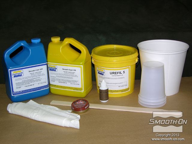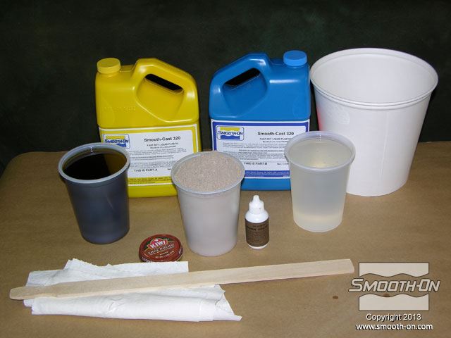 לחיצה להגדלת תמונה עבור היציקה משתמשים בשרף פוליאוריתן Smooth-Cast® 320, פיגמנט לפוליאוריטן So-Strong בגוון חום , פילר Ure-Fil® 5  ומשחת נעלים בצבע חום. מסדרים את כל החומרים והמיכלים השונים לפני התחלת היציקה. עבור היציקה משתמשים בשרף פוליאוריתן Smooth-Cast® 320, פיגמנט לפוליאוריטן So-Strong בגוון חום , פילר Ure-Fil® 5 ומשחת נעלים בצבע חום. מסדרים את כל החומרים והמיכלים השונים לפני התחלת היציקה.