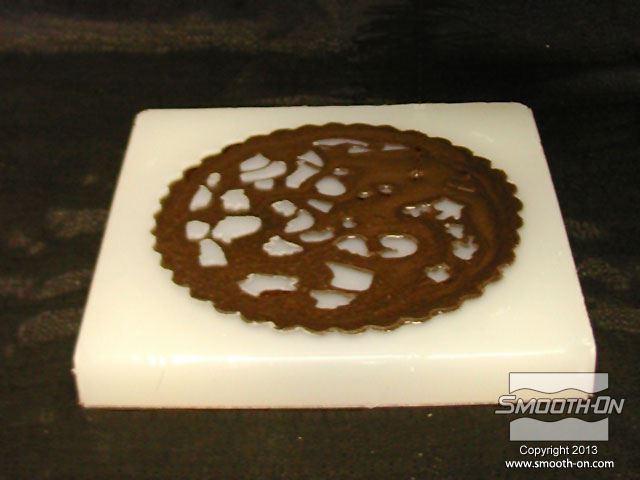 אוטמים את מודל העץ המגולף המקורי בעזרת SuperSeal®. לאחר מכן מדביקים את המודל ללוח הבסיס. בונים קופסת תבנית מלוחות מלאמין מסביב למודל, משאירים מרווח של לפחות 1.25 ס עבור הכנת התבנית משתמשים ב סיליקון ליציקה על בסיס פלטינום Dragon Skin®. מערבבים, מוציאים בועות בואקום ושופכים את הסיליקון אל קופסת התבנית. מכסים את המודל עד שהסיליקון מכסה אותו בגובה של לפחות 1.25 ס מניחים לסיליקון מהיר ליציקה ה Dragon Skin® להתמצק במשך 5 שעות. מסירים את לוחות הקופסה ו תבנית הסיליקון מהמודל המקורי. גומי סיליקון Dragon Skin® מעתיק לתבנית את כל פרטי גילוף העץ המקורי באופן מושלם. עבור היציקה משתמשים בשרף פוליאוריתן Smooth-Cast® 320, פיגמנט לפוליאוריטן So-Strong בגוון חום , פילר Ure-Fil® 5  ומשחת נעלים בצבע חום. מסדרים את כל החומרים והמיכלים השונים לפני התחלת היציקה. חשוב שהפילר Ure-Fil® 5 יהיה לגמרי נטול לחות! מומלץ לייבש את החומר בתנור ב60°C  במשך 30 דקות לפני השימוש (מניחים לחומר להתקרר חזרה לטמפ' החדר לפני השימוש). מודדים כמויות שוות לפי נפח של חלקי הבסיס והמקשה של שרף הפוליאורתן Smooth-Cast 320 וגם של הפילר Ure-Fil® 5. שופכים למיכל ערבוב את חלק המקשה של פוליאוריטן קשיח מהיר ליציקה Smooth Cast 320. מוסיפים למקשה את המלאן Ure-Fil® 5. מערבבים את המקשה והUre-Fil® 5 ביסודיות. לאחר שהמקשה והפילר מעורבבים היטב והינם במרקם חלק, מוסיפים מספר טיפות של צבע לפוליאוריטן So-Strong חום. מוסיפים לתערובת גם את חלק הבסיס. חשוב לגרד את החומר מתחתית המיכל ומצידיו מספר פעמים כדי להבטיח ערבוב טוב. לאחר שהתערובת בצבע אחיד ומעורבבת כראוי, שופכים אותה בעדינות לנקודה אחת בתבנית הסיליקון. מניחים לנוזל למלא את כל אזורי התבנית עד שחלל התבנית מלא לגמרי בשרף הפוליאוריתן. מניחים לשרף להתמצק במשך 30 דקות. בתמונה: שרף הפוליאוריתן המוצק לאחר שהוצא מתבנית סיליקון הDragon Skin. מורחים על יציקה משחת נעלים חומה כדי להעניק לה אפקט של סיבי עץ. ניתן להשתמש גם במגוון צבעי עץ לקבלת אפקטים שונים. לאחר הגימור, היציקה הינה העתק מדוייק של גילוף העץ המקורי. יציקת העץ המקורי בצד שמאל ויציקת ה פוליאוריתן קשיח בצד ימין. העתק מושלם!