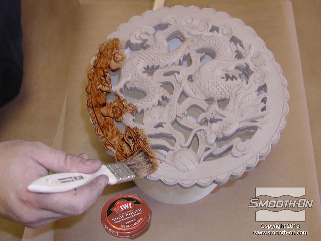 לחיצה להגדלת תמונה מורחים על יציקה משחת נעלים חומה כדי להעניק לה אפקט של סיבי עץ. ניתן להשתמש גם במגוון צבעי עץ לקבלת אפקטים שונים. מורחים על יציקה משחת נעלים חומה כדי להעניק לה אפקט של סיבי עץ. ניתן להשתמש גם במגוון צבעי עץ לקבלת אפקטים שונים.