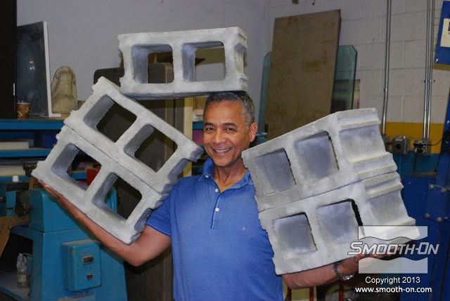 מכניסים את תבנית ה סיליקון ליציקה Mold Max 30 לתוך קופסת תבנית מעץ. בתוך תבנית הסיליקון קיימים מוטות תמיכה מעץ כך שהתבנית תשמור על צורתה בזמן היציקה. מכסה הקופסה מכיל חורים שיסייעו בשחרור הלחץ הנוצר בזמן התפשטות הקצף. מורחים על המכסה חומר הפרדה Sonite Wax, כדי למנוע מהקצף להדבק אליו. מורחים גם כל החורים במכסה חומר הפרדה Sonite Wax, כדי למנוע מהקצף להדבק. סוגרים את המכסה ומחזקים את הסגירה עם ראצ'טים. בשלב זה שמים כפפות ויניל כדי להגן על הידים. לפני שמודדים את חלק הבסיס של  ה פוליאוריתן גמיש מוקצף Flex Foam-iT! X מערבבים אותו היטב. לאחר הערבוב, מודדים את חלק הבסיס של ה פוליאוריתן מוקצף גמיש !Flex Foam-iT. מערבבים היטב גם את המקשה לפני שמודדים אותו. מודדים כמות שווה לפי נפח של המקשה. מוסיפים פיגמנט לפוליאוריתן So-Strong שחור למקשה של פוליאוריתן הFlex Foam-iT! X. מוסיפים גם פימנט So-Strong ירוק למקשה של פוליאוריטן מוקצף Flex Foam-iT! X . לבסוף, מוסיפים גם פיגמנט מרוכז לפוליאוריטן מסדרת So-Strong בצבע לבן למקשה של הפולאוריטן המוקצף Flex Foam-iT! X. מערבבים את המקשה עם הפיגמנטים השונים. שופכים את המקשה של קצף הFlex Foam-iT! X אל מיכל הערבוב. שופכים גם את הבסיס של קצף הFlex Foam-iT! X אל מיכל הערבוב. מערבבים בקפידה את שני המרכיבים. שופכים את תערובת ה פוליאוריטן מוקצף גמיש אל התבנית דרך החור במכסה. שופכים עוד מהקצף לחור בצד השני של המכסה. מניחים לקצף להתפשט אל מחוץ לקופסה ולהתמצק במשך שעה אחת. לאחר ההתמצקות חותכים את עודפי החומר שיצאו מחורי המכסה. מורידים את הראצ'טים. מורידים את מכסה קופסת התבנית. חותכים את שאריות החומר של תעלות כניסת החומר והאוורור שנשארו מהיציקה. היציקה מוכנה להוצאתה מהתבנית. הופכים את התבנית ומסירים את קופסת העץ מ תבנית הסיליקון. דוחפים את מוטות התמיכה מהעץ בעזרת מוט עץ נוסף. התבנית מוכנה לפתיחתה והוצאת היציקה. מקלפים את צידי התבנית מיציקת ה קצף פוליאוריתן. מוציאים את יציקת הפוליאוריטן הגמישה מתבנית הסיליקון. התקבלה יציקה מושלמת שדורשת מעט מאוד נקיונות. חותכים את הפלאשים הקיימים ביציקה בעזרת סכין חד. חותכים גם את הפלאשים בתחתית היציקה. מפזרים מעט טלק על פני היציקה כדי לתת לה מראה יותר אמיתי. היציקה מוכנה לשימוש. לבנים יצוקות אלו הן קלות מאוד ובטוחות לשימוש. לבנים אלו עמידות מאוד בזכות הגמישות והחוזק של פוליאוריתן מוקצף גמיש  הFlex Foam-iT! X. חוזרים על התהליך מספר פעמים לפי הצורך... ויוצרים קיר לבנים מדומות קל משקל!