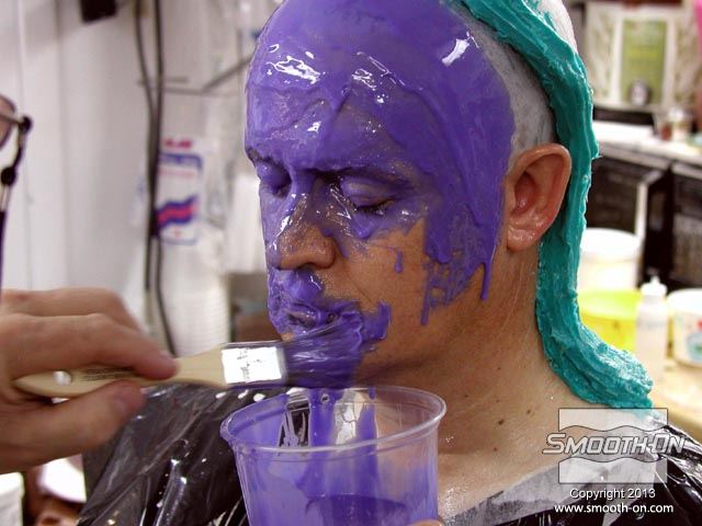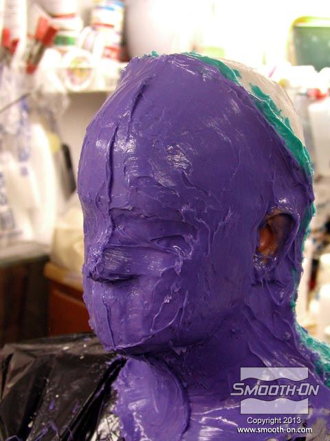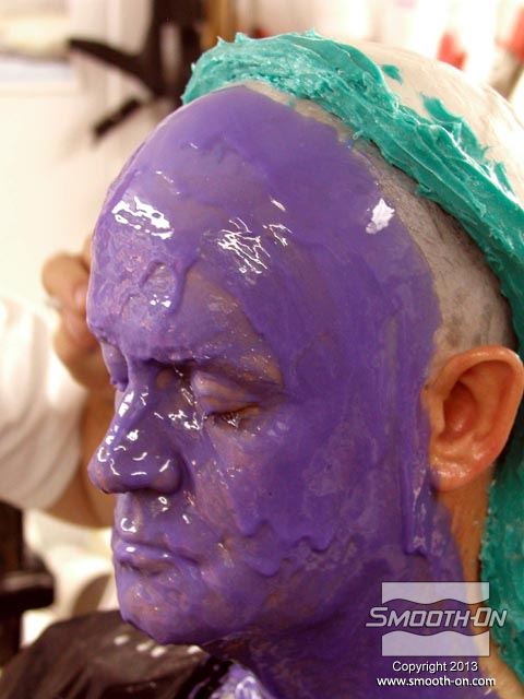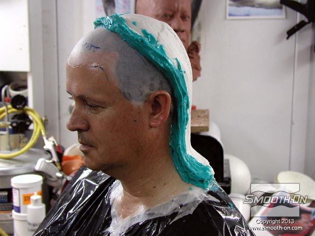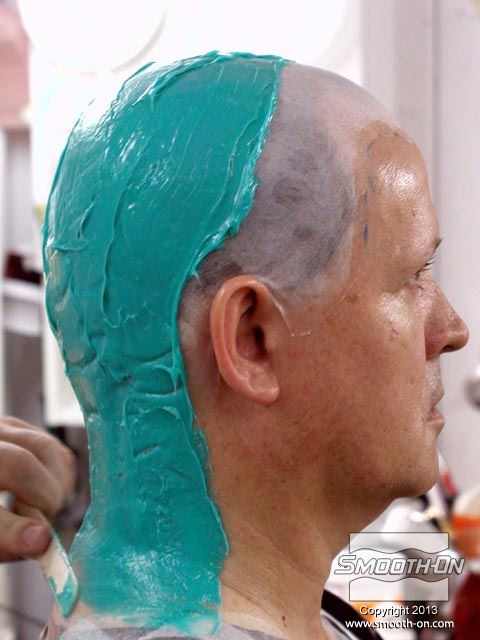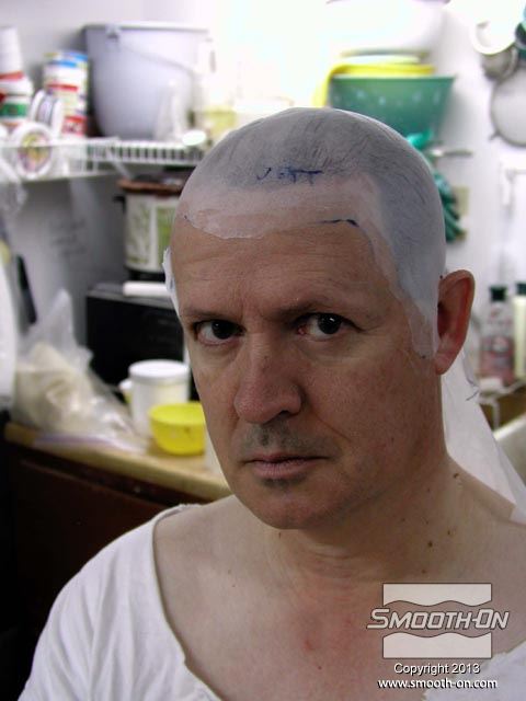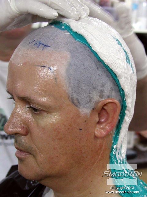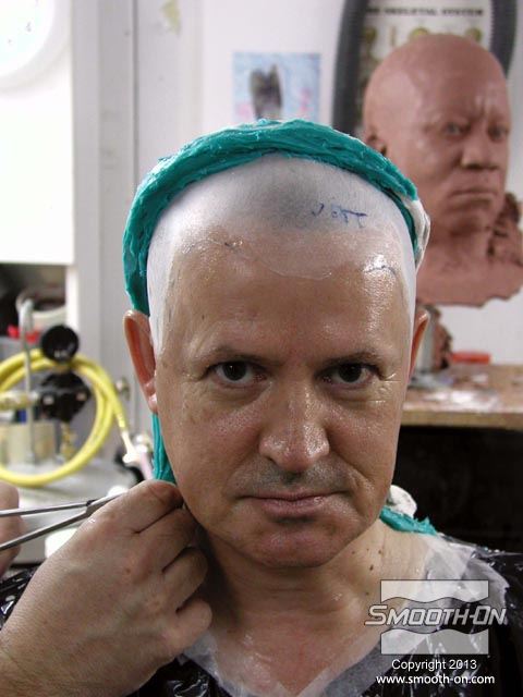 המודל שלנו - ז'אק מניחים כובע קרחת על ראש המודל כדי להגן  על השיער. מורחים אצטון על קצה הכובע על מנת מוודאים שכל הקצוות נמרחו באצטון. כובע הקרחת ממוקם כראוי. סיליקון מאושר למגע גוף Body Double מדוד מראש. כל מנה של A וB מייצגת שכבה שונה שתעורבב ותמרח לאחר מכן. מכינים תחבושות גבס מראש כדי לחסוך זמן בהמשך. מומלץ למדוד ולהכין את כל החומרים מראש. מורחים חומר הפרדה Body Double Realease cream על כל האזורים החשופים כדי למנוע משיער להיתפס בסיליקון. לאחר מכן, מערבבים סיליקון Body Double FAST SET ומתחילים למרוח אותו על אחורי הראש, מלמעלה למטה. בונים את התבנית כך שלא נצטרך לחתוך אותה בעזרת מספריים. מורחים שכבה שניה של Body Double FAST SET - הפעם עם מסמיך לסיליקון Thi-Vex® II כדי להסמיך ולעבות את התבנית. לאחר שמורחים את שתי שכבות הסיליקון מניחים תחבושות גבס על אחורי הראש כדי ליצור מעיל תמיכה עבור חצי התבנית האחורי. לאחר שהגבס הונח מורחים שכבה נוספת של Body Double FAST SET  עם מסמיך Thi-Vex® II על קו הסיליקון החשוף... ... שכבת הסיליקון  החדשה נקשרת לשכבה הקיימת. בנוסף, מורחים אותה כך שהיא עולה במעט על המעיל כדי לעזור ליצור תפר הדוק עבור היציקה בהמשך. מורחים שכבת Body Double STANDARD SET על פני המודל. את השכבה הראשונה יש להכין עם מדלל. כך יועתקו גם הפרטים הקטנים ביותר בפני המודל. את השכבה הראשונה מורחים מלמעלה למטה, שמאל לימין. חשוב: בשכבה זו לא עולים על שכבת ה FAST SET. בנוסף, משאירים את האוזניים חשופות ככל שניתן כדי שהמודל יוכל לשמוע. מורחים שכבה שניה של Body Double STANDARD SET על השכבה הראשונה, לאחר שהיא מקבלת מרקם דביק. לאחר שהשכבה השניה של הBody Double STANDARD SET נעשית דביקה השכבה השניה של הסיליקון עם המעבה נמרחה. ניתן לראות את עובי הסיליקון שמתקבל. האוזניים עדיין חשופות בשלב זה כדי לאפשר תקשורת עם המודל. סיליקון Body Double נקשר לעצמו מצויין ולא תהיה בעיה למלא את חלל האוזן בשלב מאוחר יותר. כעת יש שתי שכבות של STANDARD SET עם מעבה על פני המודל.. לאחר ששתי השכבות נמרחו על פני המודל, מכינים שתי מנות קטנות של STANDARD SET עם מעבה וממלאים את חלל האוזניים. חשוב למרוח מרחת הפרדה עבור Body Double לפני שממלאים את האוזניים! לאחר שהסיליקון ה STANDARD SET התמצק מעבר לשלב הדביק אפשר להתחיל להניח את תחבושות הגבס עבור מעיל התמיכה על החצי הקדמי של הראש. כאשר מכינים את מעיל התמיכה חשוב לא לחסום את חורי הנשימה של המודל. במקרה זה המודל נושם מהאף. לאחר סיום הנחת תחבושות הגבס נותנים להן להתמצק לגמרי (7 - 10 דקות). לאחר שתחבושות הגבס התקשו לגמרי ניתן להוריד את החצי הקדמי של המעיל ולאחר מכן את החצי הקדמי של תבנית הBody Double. בעזרת שימוש זהיר ומתוכנן ניתן להכין תבנית ראש בשני חצאים בעזרת סיליקון Body Double. בתבנית זו ניתן כעת ליצוק פוליאוריטן קשיח, גבס ועוד... ולייצר העתקות ראש מושלמות. חשוב: לאחר שמורידים את התבנית מראש המודל יש למלא את חורי הנשימה בתבנית הסיליקון בעזרת עוד Body Double.