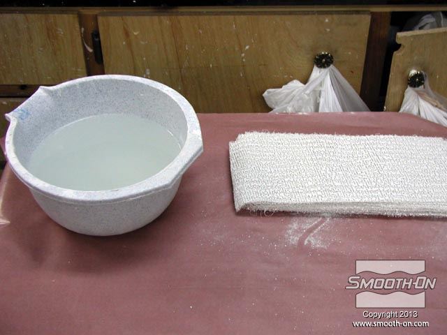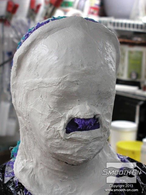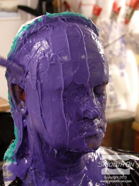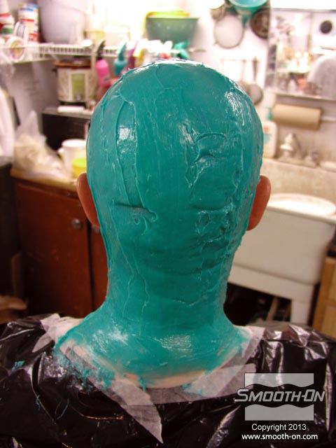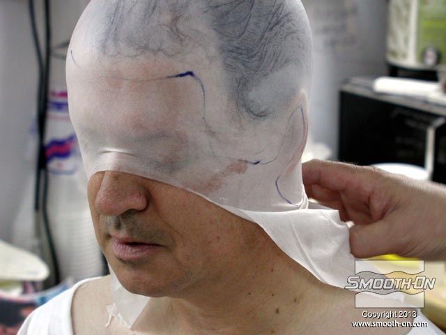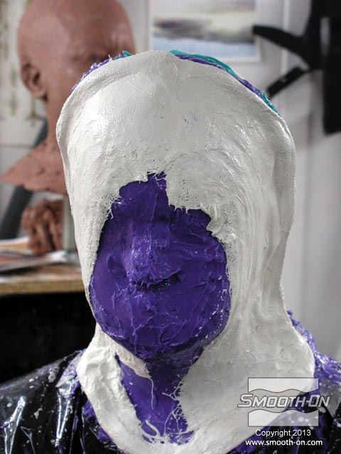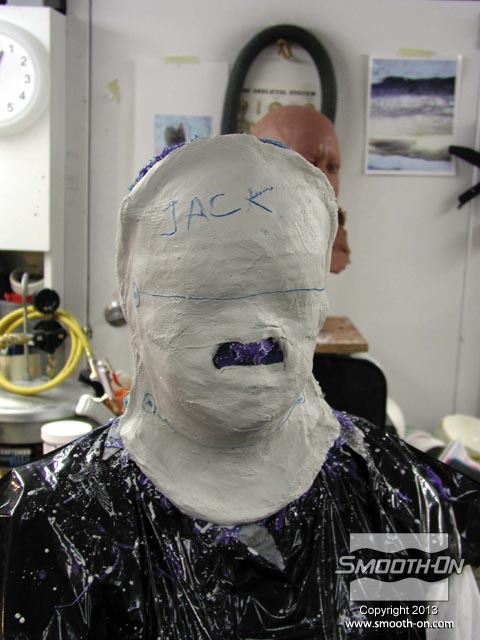 לחיצה להגדלת תמונה לאחר שמורחים את שתי שכבות הסיליקון מניחים תחבושות גבס על אחורי הראש כדי ליצור מעיל תמיכה עבור חצי התבנית האחורי. לאחר שמורחים את שתי שכבות הסיליקון מניחים תחבושות גבס על אחורי הראש כדי ליצור מעיל תמיכה עבור חצי התבנית האחורי.