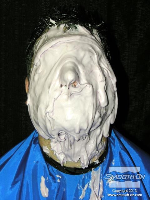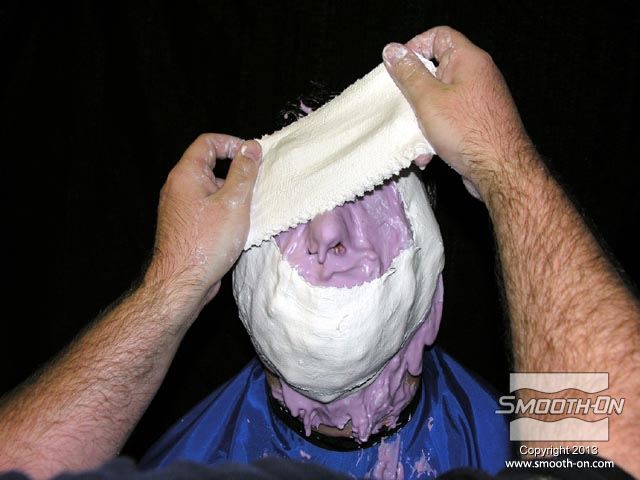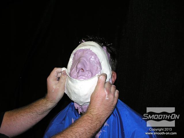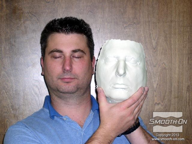 מכינים את שיער המודל ע מורחים עם הג'ל על בסיס מים גם את הגבות. המודל מוכן להעתקה. מודדים את האלגינט ®Alja-Safe ואת המים. משתמשים בקצת פחות מים מאלגינאט (לפי נפח) וכך מתקבל אלגינט סמיך יותר. שופכים את המים למיכל הערבוב. מוסיפים את הAlja-Safe למים. עבור ערבוב אידיאלי יש לערבב את המרכיבים תוך כדי ששופכים את אבקת האלגינט. שימוש במקדחה עם מערבל מאפשר לערבב כמות גדולה של אלגינט באופן אחיד ובמהירות לאחר שמערבבים את האלגינט כראוי, הוא מוכן למריחה על המודל. מורחים את הAlga-Safe, מלמעלה למטה. ניתן לעבוד עם הAlga-Safe במשך 8 דקות, כך שיש מספיק זמן למרוח את כל האזורי הפנים. מוסיפים עוד Alga-Safe עד שהתבנית מגיעה לעובי הרצוי (לפחות 1.25cm). מפסיקים למרוח כאשר כל פני המודל מכוסים. חשוב: להשאיר חורים באף כדי שהמודל יוכל לנשום. מוסיפים מלח למים פושרים( 27°C) כדי לקצר את זמן ההתקשות של תחבושות הגבס. טובלים את תחבושות הגבס במי המלח. סוחטים את עודף המים מתחבושות הגבס. מניחים את תחבושות הגבס ישירות על האלגינט. יוצרים את מסגרת מעיל התמיכה על גבי קצוות תבנית האלגינט. תחבושות הגבס "ישתלבו" עם עצמן. מכסים את כל משטח הAlga-Safe בתחבושות גבס כדי לספק תמיכה טובה לתבנית. מחליקים את המשטח החיצוני של מעיל התמיכה בזמן שהגבס עדיין לח. משתמשים בחתיכת תחבושת קטנה כדי להכין תמיכה לאף. מעיל התמיכה מגבס מוכן. משעינים את ראש המודל קדימה ומתחילים בתהליך הוצאת התבנית. מעבירים אצבע בתוך מסגרת תבנית האלגינט כדי לשחרר אותה מפני המודל. האלגינט יפרד מהפנים בקלות. תומכים בתבנית האלגינט בעזרת המעיל כדי שהיא לא תיפגם או תיקרע. לפני שיוצקים אל התבנית יש לסתום את חורי הנשימה באף במנה קטנה של Alga-Safe. חשוב לשים לב לא ליצור פרטים חדשים בתבנית בזמן שממלאים את חורי הנשימה. משתמשים בלקקן כדי להחליק את המשטח הפנימי של האלגינט. תבנית הAlga-Safe ומעיל התמיכה מוכנים. משתמשים בגבס מחוזק פולימר duoMatrix® NEO ביחס של 2 בסיס (Part A) : על 1 מקשה (Part B) עבור היציקה. ראשית שופכים את נוזל הduoMatrix® NEO למיכל הערבוב ולאחר מכן את האבקה. מערבבים עם מקדחה המחוברת למערבל כדי להכין את מנת החומר במהירות. לאחר שמערבבים, יוצקים את הduoMatrix® NEO אל תוך התבנית. ליציקת הduoMatrix® NEO לוקח שעה (60 דקות) להתמצק. לאחר מכן היא מוכנה לחליצה. תחילה מורידים את מעיל התמיכה. כעת מורידים את תבנית אלגינט Alga-Safe בעדינות מהיציקה. ניתן לראות את המודל עם העתק מדוייק של פניו.