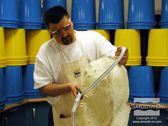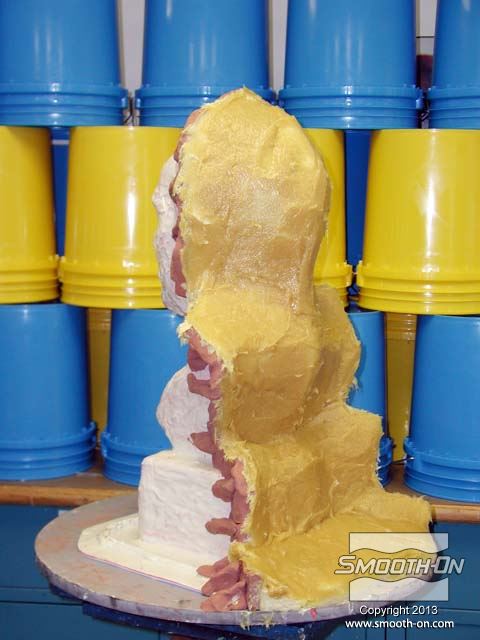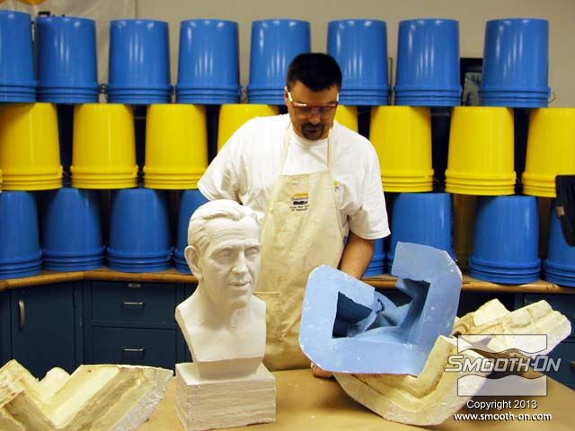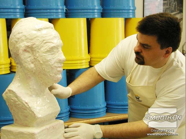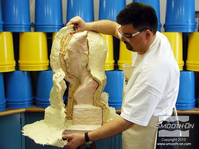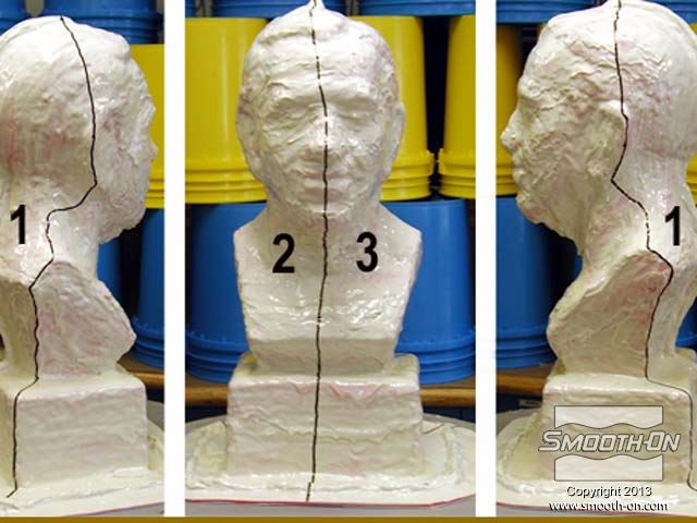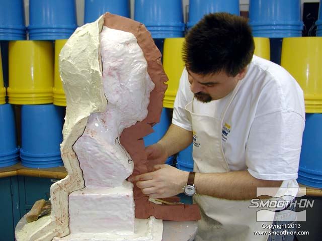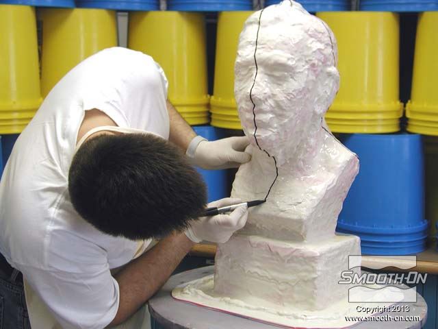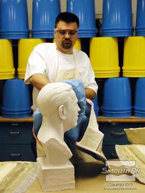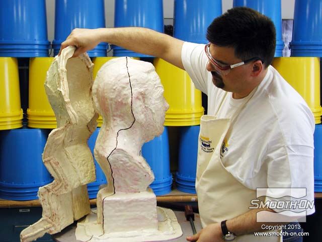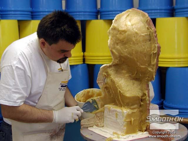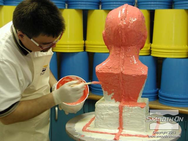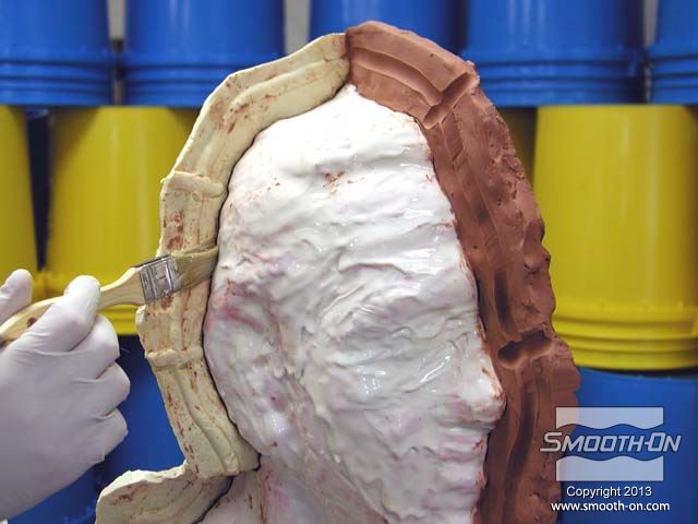 המודל- פסל גבס תלת מימדי של פני אדם חומרי העבודה בשימוש: פולאוריטן למריחה Brush-On 40, חומר אטימה Super Seal, חומר הפרדה Universal mold release, פיגמנט לפוליאוריטן בצבע כחול SO-Strong Blue, מסמיך Cab-O-Sil , כוסות ערבוב, כפפות, אקדח דבק חם, נייר ניגוב, מברשות, משקפי מגן, מקלות ערבוב. מקבעים את המודל למשטח העבודה בעזרת דבק חם. פוליאוריטן ידבק לרוב המשטחים לכן חייבים להשתמש בחומר אטימה Super Sael   ולאחריו בספריי סיליקון Universal mold release אופציה נוספת היא להשתמש בוקס נוזלי Ease Release 2831 (במקום חומר האטימה וספריי הסיליקון) . בתמונה מורחים חומר אטימה Super Seal. חומר האטימה Super seal  מיושם גם על משטח העבודה העשוי מעץ. חומר הפרדה על בסיס סיליקון Universal Mold Release  מיושם על פני שטח המודל ומשטח העבודה. יחס הערבוב של פוליאוריטן למריחה Brush-On 40 הינו 1:1 . לוקחים כוס אחת של חלק A. לוקחים כוס נוספת מחלק B. יש לדחוס את חלק B ולמלאה באופן שלם. מערבבים את הפולאוריטן יחד חלק A עם חלק B במיכל שלישי. בגלל שהמודל עשוי גבס לבן ופוליאוריטן למריחה Brush-On 40 גם הוא לבן , מוסיפים פיגמנט כחול מסדרת So-Strong על מנת שיהיה ניתן יהיה לראות אם יש כיסוי מלא של שכבת הפוליאוריטן על המודל. מערבבים היטב את חלק A וחלק B יחד עם הפיגמנט. במקרה זה הפיגמנט מאפשר לראות אם הערבוב נעשה היטב, ברגע שנעלמים הפסים הלבנים והצבע הומוגני ואחיד החומר מוכן למריחה. כאשר עובדים עם Cab-O-Sil חייבים לעבוד עם מסכה בכדי לא לנשום את האבקה. מערבבים חלק A+B יחד ומוסיפים פיגמנט לפוליאוריטן. מוסיפים מסמיך Cab-O-Sil כל פעם קצת עד לקבלת מידת הסמיכות הרצויה. מסמיכים את הפוליאוריטן למריחה יחד עם המסמיך עד לקבלת מרקם המזכיר בצק. שכבה שלישית: מערבבים ומורחים את השיכבה השלישית של פוליאוירטן למריחה Brush-On 40 על המודל. לאחר המריחה יש לבדוק כיסוי מלא. שכבה 3.5: מערבבים עוד מסמיך Cab-O-Sil עם פוליאוריטן למריחה Brush-On 40 עוברים ומעבים שוב את שבילי החיתוך ופס הנעילה על גבי ה חשוב! השכבה הראשונה היא החשובה ביותר זאת השכבה שתעתיק את הפרטים מהמודל , השכבה חייבת להיות דקיקה ורצוי לעבודת עם מברשת עם סיבים קשים או לקצוץ את שערות מברשת רגילה בחצי. אם השכבה הראשונה תהיה עבה מידי בועות אוויר יכלאו .  יש למרוח את הפוליאוריטן מלעלה למטה ולמרוח היטב את השיכבה הראשונה, למעשה יש לטפוח קלות על גבי המודל ולוודא שכל הפוליאוריטן נכנס לכל פרטי המודל. יש למרוח את הפוליאוריטן גם על בסיס העבודה ליצירת לפני מריחה שכבה נוספת יש לחכות שהתבנית היא Takcy כלומר דביקה ובמגע עם האצבע האצבע לא מתלכלכת. רק אז ניתן להמשיך לשיכבה השניה. אפשר לבדוק לאחר חצי שעה. השיכבה השניה: יש למדוד ולערבב מנה שניה של פוליאוריטן למריחה הפעם ללא פיגמנט על מנת ליצור ניגודיות שתעזור לוודא כיסוי מלא של הסיליקון מעל השכבה הראשונה. יש למרוח שכבה מעט עבה יותר . לפני מריחה שכבה נוספת יש לחכות שהתבנית היא Takcy כלומר דביקה ובמגע עם האצבע האצבע לא מתלכלכת. רק אז ניתן להמשיך לשיכבת הביניים.  אפשר לבדוק את הסיליקון לאחר חצי שעה. מסמיכים את הסיליקון או בעזרת אבקה להסמכה Cab-O-Sil  המטרה למלא זוויות שליליות ולמרוח שכבה עבה במקום המיועד לחיתוך מאוחר יותר. מתחילים לבנות את שביל החיתוך; לאחר סיום הכנת תבנית הפוליאוריטן התבנית תחתך לאורך השביל שמיוצר בשלב זה. יישום המריחה הוא מלמעלה למטה.  יש ליישם את הפוליאוריטן הסמיך גם על משטח העבודה את הפוליאוריטן הסמיך מורחים וסותמים חורים כמו עיניים, אוזניים, או כל מקום אחר שיכול ליצור נעילה מכאנית בין הגיבוי של התבנית לבין הפוליאוריטן. לאחר 90 דקות מוצאים את החימר לעיצוב.   קו חלוקה נוסף נבנה על גבי  הקו המשורטט מהראש דרך הפנים מטה. מחזקים את קו החלוקה עם חימר לעיצוב. מורחים חומר הפרדה על בסיס וקס Ease Release 2831/Sonite Wax. סותמים שוב חורים כמו עיניים, אוזניים, או כל מקום אחר שיכול ליצור נעילה מכאנית בין הגיבוי של התבנית לבין הפוליאוריטן. שכבה רביעית:  מערבבים פוליאוירטן למריחה ללא מסמיך או פי