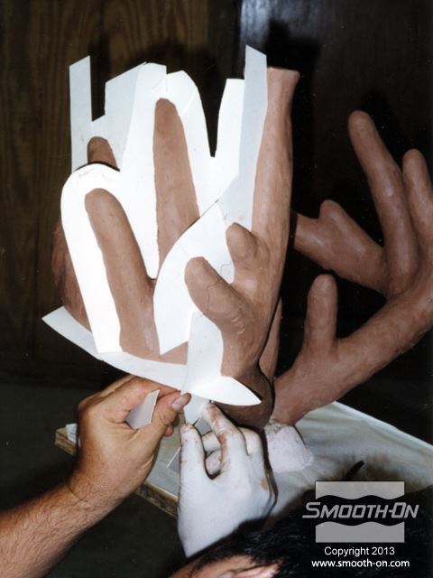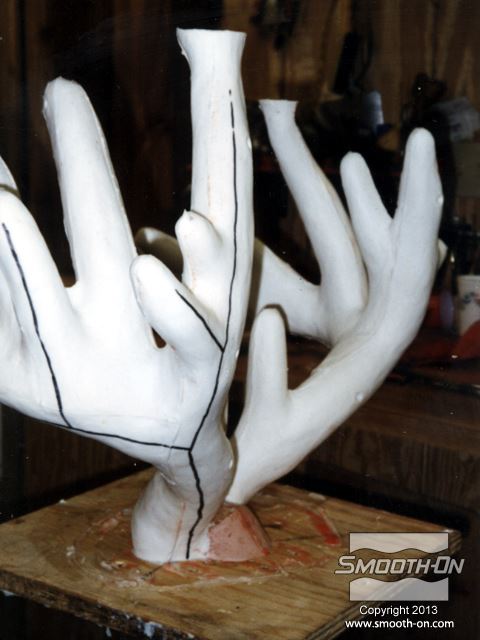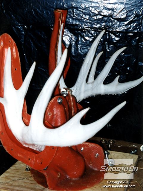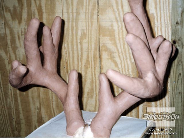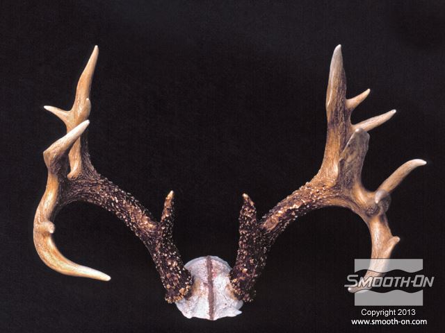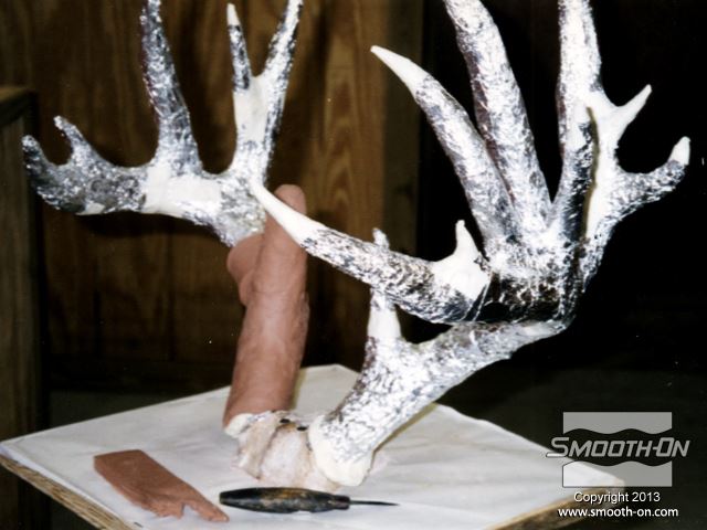 ראשית, מדביקים את מודל הקרניים המקוריי ללוח בסיס ומרססים בשכבה נדיבה של ספריי אקריליק שקוף. עוטפים את הקרניים בנייר אלומיניום כדי להגן עליהם. מרדדים חימר נטול גופרית LBT\NSP לעובי 1 ס מכסים את הקרניים לגמרי בחימר כדי ליצור מקום לתבנית הסיליקון. יוצרים מחיצות מקרטון במקומות אסטרטגיים, כדי להפריד בין חלקי מעיל התמיכה. מורחים שכבת ג'ל קוט על ראשונה על המודל וממלאים אנדרקאטים בעזרת סיליקון עם מסמיך. מחזקים את חלקי מעיל התמיכה בסיבי זכוכית. מניחים לכל חלק במעיל התמיכה להתמצק לגמרי לפני שממשיכים לחלק הבא. מניחים לכל מעיל התמיכה להתמצק לגמרי. חותכים גראדים וקצוות חדים. קודחים חורים בקוטר כ0.6 ס מסירים בזהירות את מעיל התמיכה בזהירות מהקרניים. לא מסירים את הקרניים מהבסיס! מסירים את החימר ונייר האלומיניום מהקרניים וממעיל התמיכה. מורחים שכבה דקה של סיליקון להכנת תבנית Mold Max® 30 על הקרניים כדי לצמצם לכידה של בועות אוויר. מורחים חומר הפרדה Sonite Wax על כל המשטחים הפנימיים של מעיל התמיכה. לאחר מכן, בונים אותו מחדש סביב הקרניים ונועלים את הברגים. יוצקים למעיל התמיכה סיליקון להכנת תבניות Mold Max® 30 בזרם ארוך ודק. לאחר שהסיליקון Mold Max® 30 מתמצק לגמרי, מסירים את מכיל התמיכה ומסמנים בטווש קווי תפר על אזורי תבנית הסיליקון אותם צריך לחתוך. קווי התפר בתבנית הסיליקון צריכים להיות שונים מקווי התפר של מעיל התמיכה. אין צורך לחתוך אזורים בסיליקון שמכסים קצוות קטנים במודל. בזמן שחותחכים את הסיליקון Mold Max® 30 עם סכין חד, יש לפתוח אותו בעדינות משני הצדדים כדי להקל על ביצוע החיתוך. מסירים את תבנית הסיליקון Mold Max® 30 לגמרי מהמודל. מודדים, מערבבים ויוצקים פוליאורטן קשיח Smooth-Cast® 320 לאחד מצידי הקרניים כך שהחומר יגיע עד לקצוות. מגלגלים את התבנית כדי לוודא שהפוליאוריתן ליציקה Smooth-Cast® 320 יגיע לכל הקצוות בתבנית הסיליקון Mold Max 30. חוזרים על התהליך עבור הצד השני. לאחר שיוצקים את שני צידי המודל, נועלים את שתי הקרניים במרכז ויוצקים את חלק הגולגולת של המודל. לאחר שיוצקים את הגולגולת מניחים לפוליאוריתן קשיח Smooth-Cast® 320 להתמצק לגמרי במשך 45-60 דקות. גימור - צובעים את יציקת הפוליאורתן קשיח Smooth-Cast® 320 בעזרת צבע Polytranspar וצבע Lifetone כדי להעניק לקרניים מראה מציאותי.