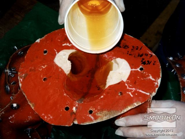 לחיצה להגדלת תמונה מודדים, מערבבים ויוצקים פוליאורטן קשיח Smooth-Cast® 320 לאחד מצידי הקרניים כך שהחומר יגיע עד לקצוות. מודדים, מערבבים ויוצקים פוליאורטן קשיח Smooth-Cast® 320 לאחד מצידי הקרניים כך שהחומר יגיע עד לקצוות.