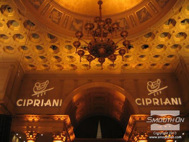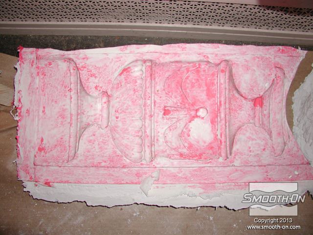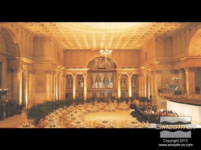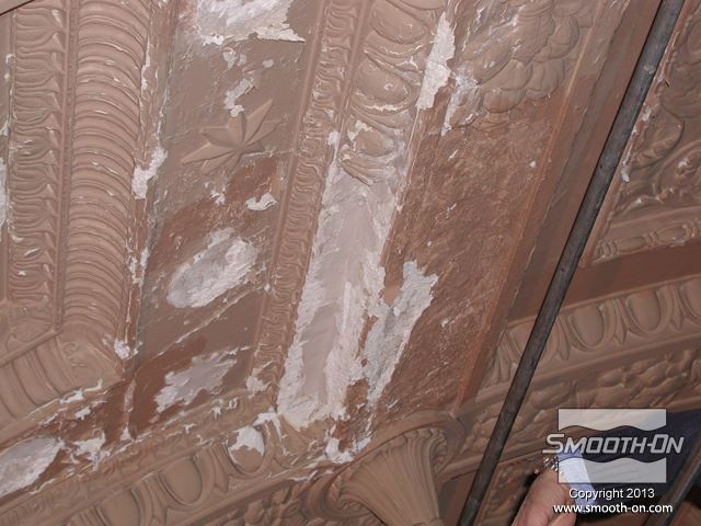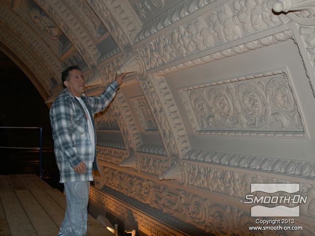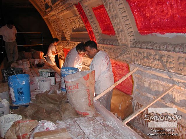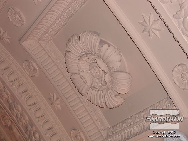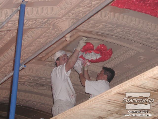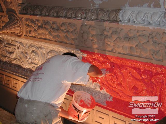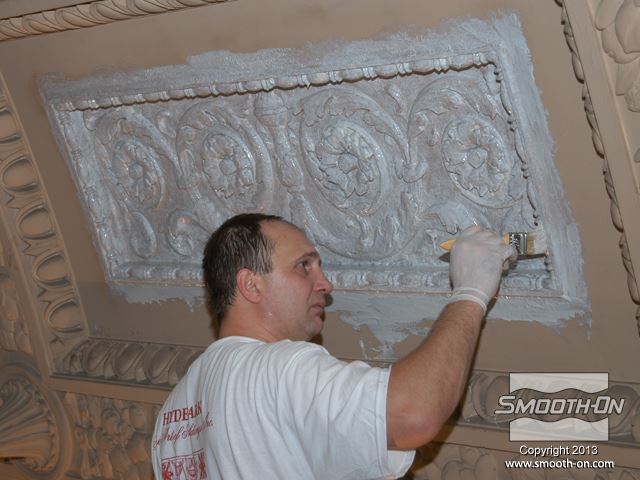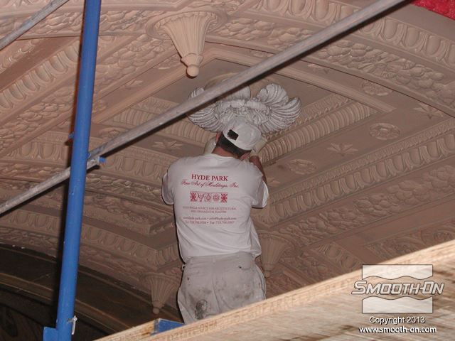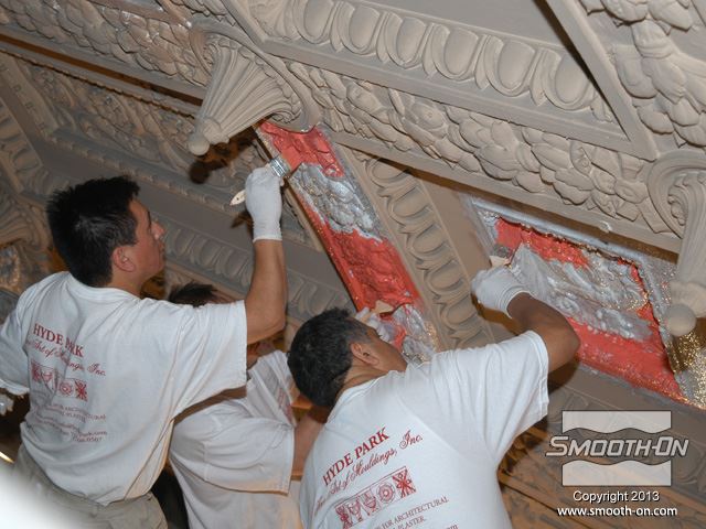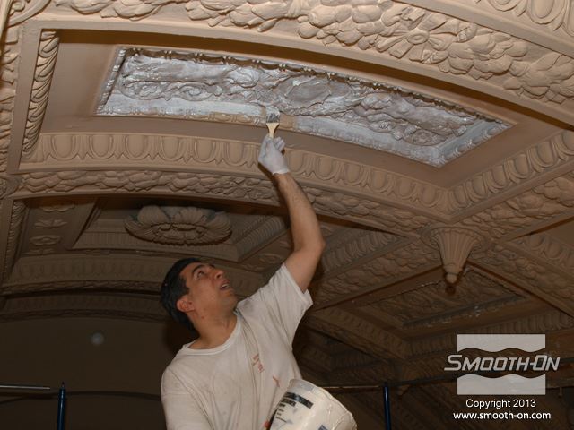 שיחזור תקרת אולם נשפים בגובה 27.5 מטר במלון  The Regent Hotel במנהטן ניו יורק איכות עיטורי הטיח ההסטורי הדרדרו עם הזמן לפני בחירת התבנית נערכת בחינה דקדקנית של הקשת המיועדת לשיחזור על שטח השיחזור נמרח חומר אטימה super seal וחומר הפרדה Universal release. לאחר מכן נמרחה שכבה ראשונה של Brush-on 40. שיכבת המריחה הראשונה של פוליאוריטן Brush-on 40 היא דקה ביותר. את Brush-on 40 ניתן למרוח בשטח מאונך או אפילו על התקרה ללא נזילות. פיגמנט לפוליאוריטן SO-STRONG מתווסף לכל שיכבה של Brush-on 40. התוצאה: ניתן להבחין בין שכבת מריחה אחת לשניה ולדעת היכן יש חוסר בפוליאוריטן. תבליטים ארכיטקטונים יכולים להיות לעיתים מורכבים וקשים לשיחזור.  Brush-on 40 יעתיק בצורה מושלמת את התבליט המקורי גם אם הוא מורכב ביותר. עובד אחד מורח את ה Brush-On 40 ועובד שני מכין את השטח לפני המריחה של הפוליאוריטן. מומלץ למרוח 4 שכבות של פוליאוריטן בכדי להגיע לעובי מומלץ של 1 ס לאחר מריחת כל השכבות, יש להשאיר את הפוליאוריטן להתקשות בטמפ' החדר למשך לילה. יום למחרת מורחים שיכבת גיבוי קשיחה (מעיל) על גבי פוליאוריטן Brush-on 40 על מנת לתת תמיכה לגומי. בגמר הכנת התבנית מניחים את הפוליאוריטן בתוך מעיל הגיבוי והתבנית מוכנה ליציקה. החלקים שנוצקו בתבנית העשויים מגבס או מבטון שולבו בתקרה המקורית בצורה מושלמת. התוצאה: החלק הניזוק שופץ והוחלף בחלקים חדשים והפאר המקורי של המבנה חזר לקדמותו.
