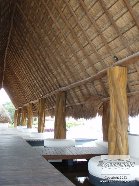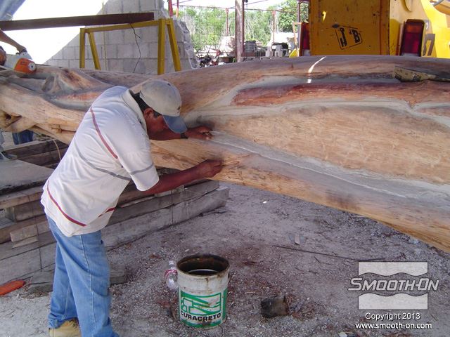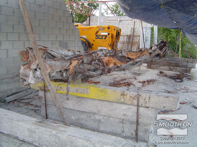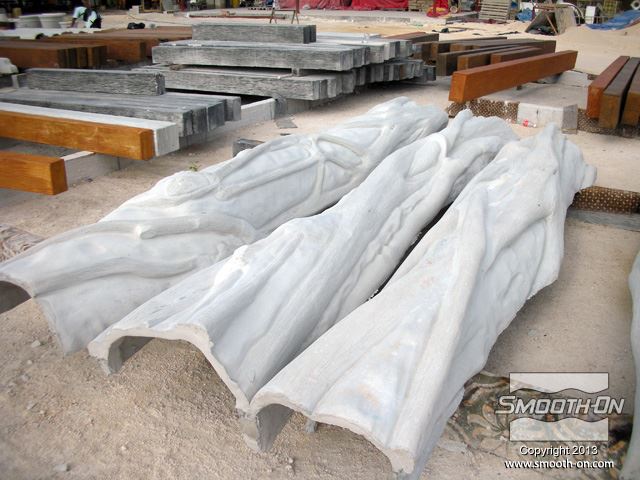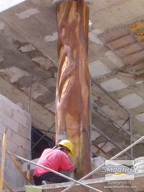 גזע הפיקוס שנחתך לפני הכנת התבנית. יש להכין את העץ היטב לפני שמתחילים ליצור את התבנית. ההכנה כוללת גילוף עודפי עץ מיותרים, ליטוש וניקוי הגזע סותמים זויות שליליות של המודל (Undercuts), תוך כדי תשומת לב לא לפגוע בצורה המקורית של הגזע. סתימת הזויות השליליות מונעת נעילה מכאנית של גיבוי התבנית. לאחר הניקוי וסצימת הזויות השליליות של המודל, מורחים חומר אטימה Super Seal  על הגזע בכך סותמים נקבוביות במודל ומונעים ריאקציה כימית של הסיליקון Rebound 25. מורחים 4 שכבות של סיליקון Rebound 25 עד להגעה לעובי של 1 ס מניחים לתבנית להתקשות, ואח לאחר התקשות שכבת הגיבוי חולצים אותה ואחריה את הסיליקון מהמודל. Rebound 25  הינו סיליקון חזק מאוד והוא יכול להיחלץ בקלות ללא חשש שיקרע. Rebound 25 מעתיק בצורה מושלמת כל פרט ופרט במודל עץ הפיקוס. מניחים את הסיליקון בתוך הגיבוי. תבנית הסיליקון מוכנה ליציקה. יציקת GFRC נעשית בשכבות, ראשית מתיזים שכבה בטון על התבנית. סיבי זכוכית קצוצים מותזים על שיכבת הבטון הראשונית. סיבי הזכוכית יתנו למוצר הסופי תכונות חוזק יוצאות מן הכלל. שכבות נוספות של בטון וסיבי זכוכית מותזות על התבנית עד לקבלת העובי הרצוי. לאחר ההתקשות ניתן לחלץ את הבטון מתבנית הסיליקון Rebound 25 והמוצר מוכן להתקנה. כלל חלקי התבנית מוצבים סביב העמוד המיועד לציפוי, המרווחים נאטמים בעזרת GFRC נוסף ושיוף. העמוד נצבע בצבעים זהים למקור. החלקים הגמורים שיוצרו נראים בדיוק כמו עץ פיקוס מקורי . על מנת ליצור חלקים מדוייקים למקור כמו עץ פיקוס, חובה להשתמש בחומרים היודעים להעתיק את הפרטים בצורה מושלמת. סיליקון Rebound 25  יעתיק אפילו את הפרטים הקטנים ביותר סיליקון Rebound 25 ניתן לשימוש חוזר רב-פעמי ליצירת אלמנטים ארכיטקטונים שונים סיליקון Rebound 25 ניתן לשימוש חוזר רב-פעמי ליצירת אלמנטים ארכיטקטונים שונים