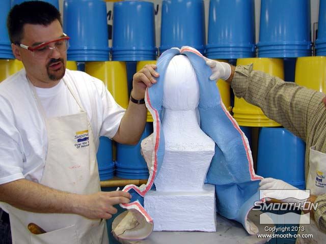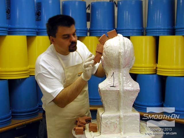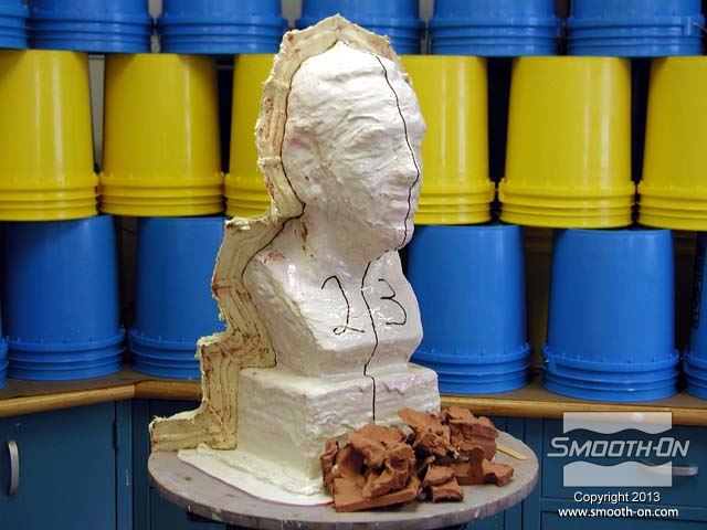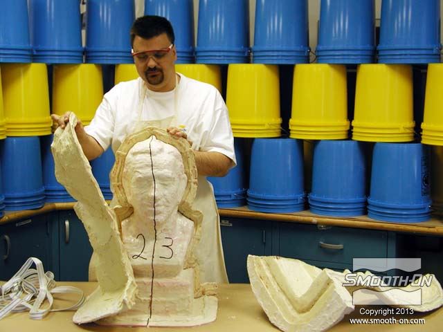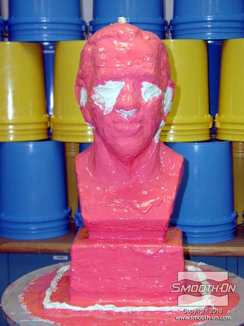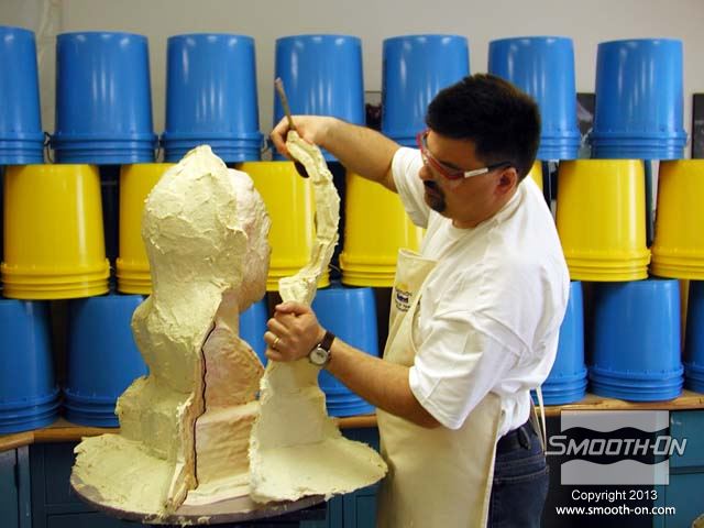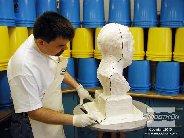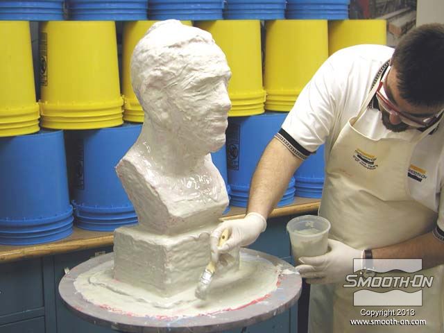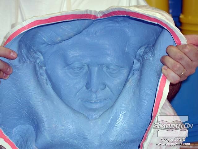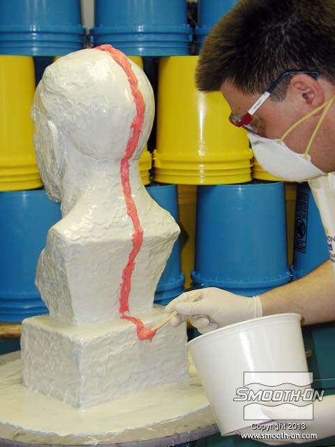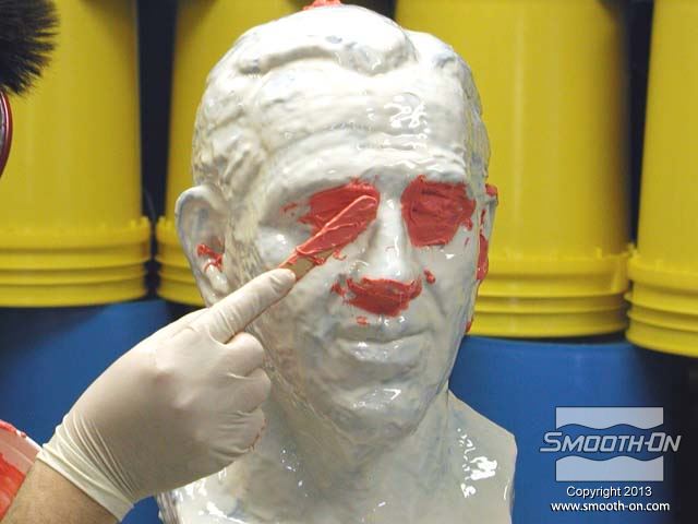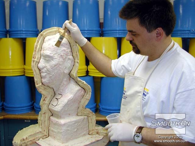 המודל- פסל גבס תלת מימדי של פני אדם חומרי העבודה בשימוש: פולאוריטן למריחה Brush-On 40, חומר אטימה Super Seal, חומר הפרדה Universal mold release, פיגמנט לפוליאוריטן בצבע כחול SO-Strong Blue, מסמיך Cab-O-Sil , כוסות ערבוב, כפפות, אקדח דבק חם, נייר ניגוב, מברשות, משקפי מגן, מקלות ערבוב. מקבעים את המודל למשטח העבודה בעזרת דבק חם. פוליאוריטן ידבק לרוב המשטחים לכן חייבים להשתמש בחומר אטימה Super Sael   ולאחריו בספריי סיליקון Universal mold release אופציה נוספת היא להשתמש בוקס נוזלי Ease Release 2831 (במקום חומר האטימה וספריי הסיליקון) . בתמונה מורחים חומר אטימה Super Seal. חומר האטימה Super seal  מיושם גם על משטח העבודה העשוי מעץ. חומר הפרדה על בסיס סיליקון Universal Mold Release  מיושם על פני שטח המודל ומשטח העבודה. יחס הערבוב של פוליאוריטן למריחה Brush-On 40 הינו 1:1 . לוקחים כוס אחת של חלק A. לוקחים כוס נוספת מחלק B. יש לדחוס את חלק B ולמלאה באופן שלם. מערבבים את הפולאוריטן יחד חלק A עם חלק B במיכל שלישי. בגלל שהמודל עשוי גבס לבן ופוליאוריטן למריחה Brush-On 40 גם הוא לבן , מוסיפים פיגמנט כחול מסדרת So-Strong על מנת שיהיה ניתן יהיה לראות אם יש כיסוי מלא של שכבת הפוליאוריטן על המודל. מערבבים היטב את חלק A וחלק B יחד עם הפיגמנט. במקרה זה הפיגמנט מאפשר לראות אם הערבוב נעשה היטב, ברגע שנעלמים הפסים הלבנים והצבע הומוגני ואחיד החומר מוכן למריחה. חשוב! השכבה הראשונה היא החשובה ביותר זאת השכבה שתעתיק את הפרטים מהמודל , השכבה חייבת להיות דקיקה ורצוי לעבודת עם מברשת עם סיבים קשים או לקצוץ את שערות מברשת רגילה בחצי. אם השכבה הראשונה תהיה עבה מידי בועות אוויר יכלאו .  יש למרוח את הפוליאוריטן מלעלה למטה ולמרוח היטב את השיכבה הראשונה, למעשה יש לטפוח קלות על גבי המודל ולוודא שכל הפוליאוריטן נכנס לכל פרטי המודל. יש למרוח את הפוליאוריטן גם על בסיס העבודה ליצירת לפני מריחה שכבה נוספת יש לחכות שהתבנית היא Takcy כלומר דביקה ובמגע עם האצבע האצבע לא מתלכלכת. רק אז ניתן להמשיך לשיכבה השניה. אפשר לבדוק לאחר חצי שעה. השיכבה השניה: יש למדוד ולערבב מנה שניה של פוליאוריטן למריחה הפעם ללא פיגמנט על מנת ליצור ניגודיות שתעזור לוודא כיסוי מלא של הסיליקון מעל השכבה הראשונה. יש למרוח שכבה מעט עבה יותר . לפני מריחה שכבה נוספת יש לחכות שהתבנית היא Takcy כלומר דביקה ובמגע עם האצבע האצבע לא מתלכלכת. רק אז ניתן להמשיך לשיכבת הביניים.  אפשר לבדוק את הסיליקון לאחר חצי שעה. מסמיכים את הסיליקון או בעזרת אבקה להסמכה Cab-O-Sil  המטרה למלא זוויות שליליות ולמרוח שכבה עבה במקום המיועד לחיתוך מאוחר יותר. כאשר עובדים עם Cab-O-Sil חייבים לעבוד עם מסכה בכדי לא לנשום את האבקה. מערבבים חלק A+B יחד ומוסיפים פיגמנט לפוליאוריטן. מוסיפים מסמיך Cab-O-Sil כל פעם קצת עד לקבלת מידת הסמיכות הרצויה. מסמיכים את הפוליאוריטן למריחה יחד עם המסמיך עד לקבלת מרקם המזכיר בצק. מתחילים לבנות את שביל החיתוך; לאחר סיום הכנת תבנית הפוליאוריטן התבנית תחתך לאורך השביל שמיוצר בשלב זה. יישום המריחה הוא מלמעלה למטה.  יש ליישם את הפוליאוריטן הסמיך גם על משטח העבודה את הפוליאוריטן הסמיך מורחים וסותמים חורים כמו עיניים, אוזניים, או כל מקום אחר שיכול ליצור נעילה מכאנית בין הגיבוי של התבנית לבין הפוליאוריטן. שכבה שלישית: מערבבים ומורחים את השיכבה השלישית של פוליאוירטן למריחה Brush-On 40 על המודל. לאחר המריחה יש לבדוק כיסוי מלא. שכבה 3.5: מערבבים עוד מסמיך Cab-O-Sil עם פוליאוריטן למריחה Brush-On 40 עוברים ומעבים שוב את שבילי החיתוך ופס הנעילה על גבי ה סותמים שוב חורים כמו עיניים, אוזניים, או כל מקום אחר שיכול ליצור נעילה מכאנית בין הגיבוי של התבנית לבין הפוליאוריטן. שכבה רביעית:  מערבבים פוליאוירטן למריחה ללא מסמיך או פיגמנט ומורחים את השכבה הרביעית והאחרונה. נותנים לפוליאוריטן להתקשות במהלך הלילה.  יום למחרת: מכינים את תבנית הגיבוי. החומרים שמשתמשים בהם- פוליאוריטן מחוזק בסיבי זכוכית למריחה Pl