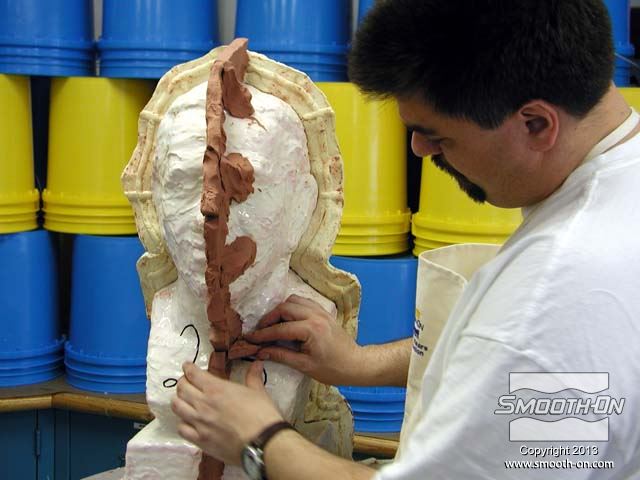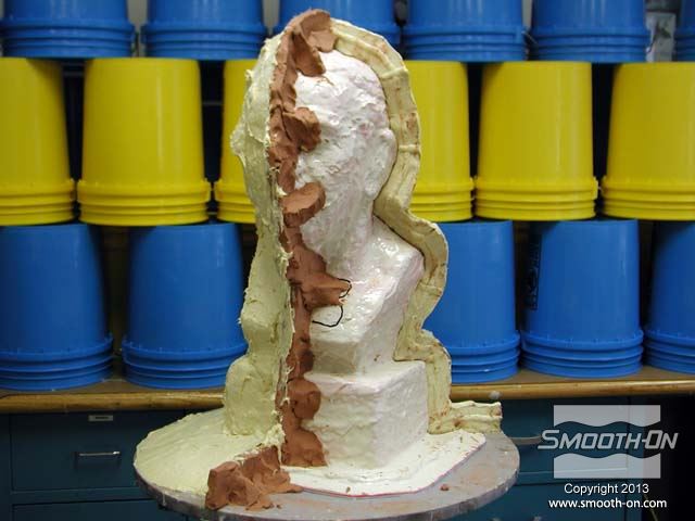 לחיצה להגדלת תמונה מורחים את החימר ומורחים שכבה של חומר הפרדה על בסיס וקס על החלק השלישי והחשוף של המודל. מורחים את החימר ומורחים שכבה של חומר הפרדה על בסיס וקס על החלק השלישי והחשוף של המודל.