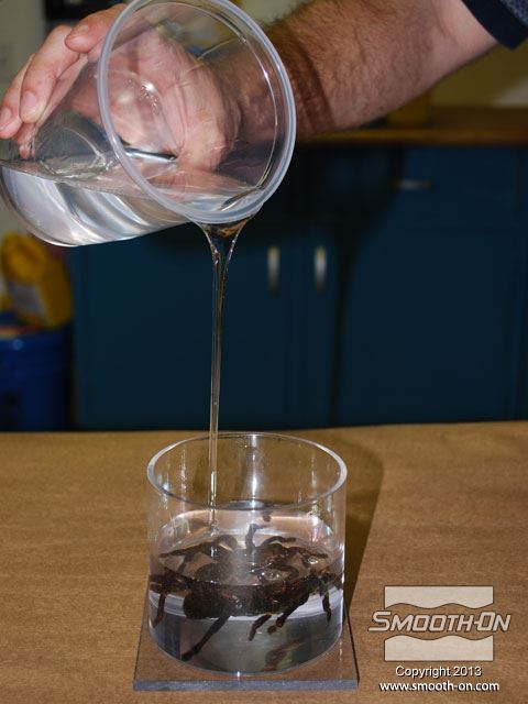 לחיצה להגדלת תמונה מודדים ומערבבים מנה נוספת של סיליקון לצרירה (לכידה) Encapso® K. שופכים לאט על הנקודה הנמוכה במיכל. מניחים לנוזל לעלות בעצמו על הטרנטולה. שופכים חומר עד שמגיעים לגובה של כ1.5 ס מודדים ומערבבים מנה נוספת של סיליקון לצרירה (לכידה) Encapso® K. שופכים לאט על הנקודה הנמוכה במיכל. מניחים לנוזל לעלות בעצמו על הטרנטולה. שופכים חומר עד שמגיעים לגובה של כ1.5 ס"מ מעל הנקודה גבוהה בטרנטולה.