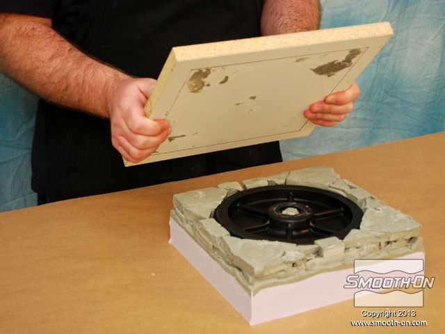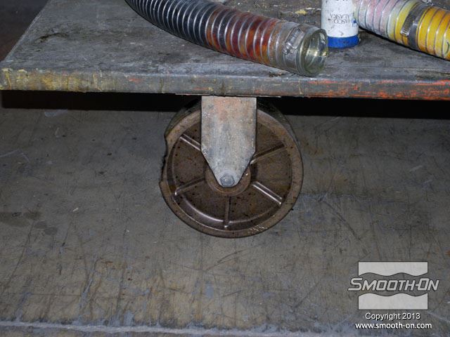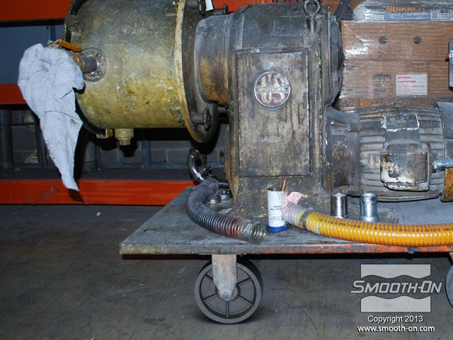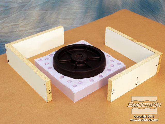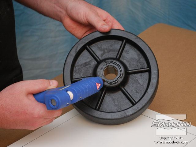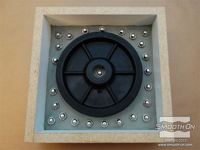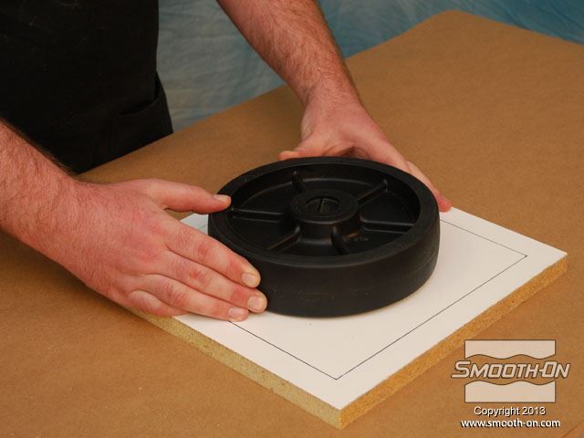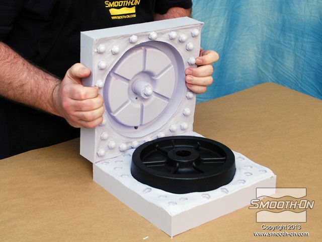 מציאת חלקי חילוף עבור ציוד ישן שלא מיוצר יותר, היא משימה קשה עד בלתי ניתנת לביצוע. בתמונה, גלגל פגום תומך במשאבה תעשייתית ישנה אך מתפקדת ויש צורך להחליפו. הכנת החלק בדיפוס שבבי יכול להעלות כ1000 דולר. דרך זולה ומהירה יותר היא להכין תבנית מהגלגל הקיים וליצוק גלגל חדש מגומי או חומר אחר. מסירים מעגלת המשאבה גלגל אחד תקין ומנקים אותו. ממלאים פגמים קטנים בגלגל בעזרת אפוקסי דו קומפוננטי. מודדים את הגלגל כדי להכין את מסגרת לתבנית (שתכיל את הגומי הנוזלי). מכינים מסגרת לקופסה ממלאמין כך שישאר מרווח של 2.54cm מסביב למודל. מניחים את מסגרת המלאמין על לוח הבסיס ממלמאמין ומסמנים את גבולותיה. מורחים דבק חם על תחתית ציר הגלגל. ממרכזים את הגלגל על לוח הבסיס המסומן. חותכים חתיכות בעובי 1cm של חימר על בסיס שמן, ללא גופרית. מניחים את חתיכות המתכת על גבי הלוח מסביב לגלגל. לאחר שכבת החימר עבה מספיק, מניחים את המסגרת מעל המודל. מחליקים את החימר בעזרת כלי פיסול. תוקעים בחימר ברגים קטנים עם ראש עגול (Acorn Nuts) מסביב לדגם. מטרת הברגים היא ליצור חצי תבנית מציירים קווים על חוץ התבנית כדי לציין את צורת הרכבת המסגרת. משלב זה ועד סוף תהליך הכנת התבנית לובשים כפפות ויניל. מודדים בעזרת משקל גרמים את חלק הבסיס של הסיליקון Mold Max® 25. מודדים על המשקל גם את חלק המקשה של הסיליקון. יחס הערבוב הוא 100A:5B. סיליקון Mold Max® 25 הינו קל ביותר לערבוב. מערבבים ביסודיות במשך 3 דקות. לאחר הערבוב הראשוני, מעבירים את סיליקון הMold Max® 25 למיכל חדש ושוב מערבבים במשך 3 דקות. שמים את המיכל בתא ואקום ומשחחרים גזים במשך 2 דקות, עד שהתערובת עולה, נשברת ונופלת. לאחר שסיליקון הMold Max® 25 מעורבב ועבר ואקום, שופכים אותו באיטיות על המודל. מניחים לMold Max® 25 להתקשות במשך 24 שעות. לאחר שהחומר התמצק, מפרקים את המסגרת. החימר מחלק את התבנית לחצאים. הופכים את התבנית... ואז, מורידים את לוח הבסיס. מורידים את החימר ואת הברגים העגולים. מכינים את החצי השני של תבנית הסיליקון על גבי הצד ההפוך של המודל העטוף בסיליקון. מחברים מחדש את המסגרת בעזרת ברגים. מרססים חומר הפרדה  Ease Release® 200 על כל המשטחים. חומר ההפרדה  Ease Release® 200 דואג שהסיליקון הנוזלי לא ידבק לסיליקון המוצק. מחברים משפך לדגם בעזרת חתיכת חימר קטנה, כדי לאפשר יציקה קלה של חומר אל התבנית הגמורה, מאוחר יותר. מודדים, מערבבים, שמים בואקום ושופכים מנה נוספת של סיליקון  Mold Max® 25 על המודל וחצי התבנית שכבר מוכן. מניחים לתבנית הMold Max® 25  להתקשות במשך 24 שעות. מוציאים את משפך הפלסטיק. מוציאים את הברגים מהמסגרת. מורידים את צידי המסגרת. שני חצאי התבנית נפרדים בקלות בזכות חומר ההפרדה Ease Release 200. סיליקון Mold Max® 25 מעתיק את הגיאומטריה המדוייקת של הגלגל המקורי. בעזרת סכין, משחיזים בזהירות קצה אחד של צינור פליז. לוחצים את צינור הפליז אל תוך תבנית הסיליקון (בחלק לא קריטי). צינור הפליז יצור חור בתבנית הסיליקון שיהווה פתח אוורור. משתמשים בגומיות דואר כדי להדק את שני חצאי התבנית אחד לשני. מציבים את התבנית בזווית של 45 מעלות כדי לעזור לאוויר לצאת בזמן שהשרף ממלא את חלל התבנית. מחזירים את משפך הפלסטיק למקומו. עבור היציקה, משתמשים בפוליאוריתן עמיד באימפקט ושחור - TASK 14. ראשית מערבבים את חלק B של הTASK 14. שוקלים על משקל גרמים את חלק A של הפוליאוריתן TASK 14. מודדים את חלק B של הTASK 14. יחס הערבוב הוא 100A:150B, לפי משקל. שופכים את חלק A של הפוליאוריתן למיכל ערבוב נקי. מוסיפים גם את חלק B למיכל. מערבבים ביסודיות את החומר במשך 90 שניות. שופכים את הפוליאוריתן TASK 14 אל התבנית, בעזרת המשפך ופתח האוורור. חומר עודף יוצא מפתח האוורור. מניחים TASK 14 להתקשות במשך 45 דקות. לאחר שהשרף מתמצק מוציאים את המשפך. מסירים את השרף העודף. מסירים את הגומיות. מפרידים את חצאי התבנית וחושפים את היציקה. מסירים בעזרת סכין יפנית את עודפי החומר שבמשפך ובחור האוורור. היציקה העתיקה באופן מושלם את כל פרטי הגלגל המקורי. תב