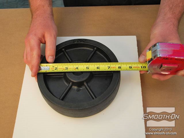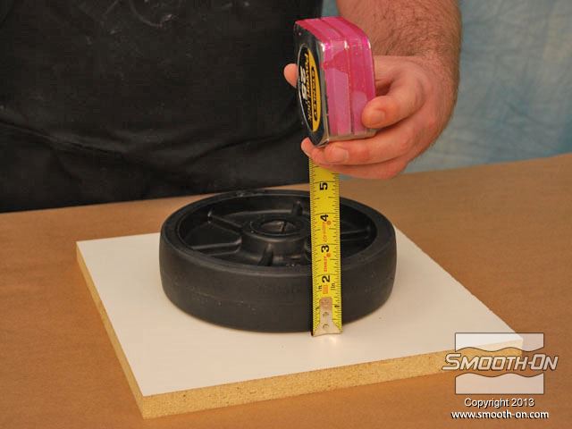 לחיצה להגדלת תמונה מודדים את הגלגל כדי להכין את מסגרת לתבנית (שתכיל את הגומי הנוזלי). מודדים את הגלגל כדי להכין את מסגרת לתבנית (שתכיל את הגומי הנוזלי).