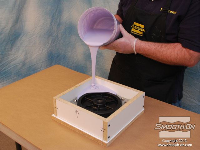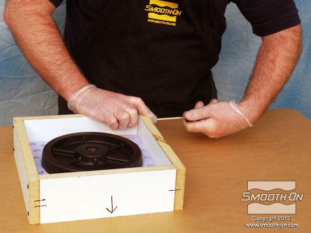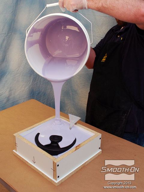 לחיצה להגדלת תמונה לאחר שסיליקון הMold Max® 25 מעורבב ועבר ואקום, שופכים אותו באיטיות על המודל. לאחר שסיליקון הMold Max® 25 מעורבב ועבר ואקום, שופכים אותו באיטיות על המודל.