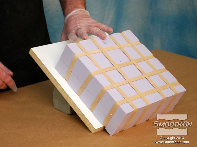 לחיצה להגדלת תמונה מציבים את התבנית בזווית של 45 מעלות כדי לעזור לאוויר לצאת בזמן שהשרף ממלא את חלל התבנית. מציבים את התבנית בזווית של 45 מעלות כדי לעזור לאוויר לצאת בזמן שהשרף ממלא את חלל התבנית.
