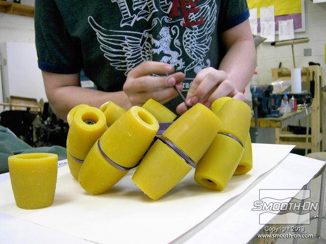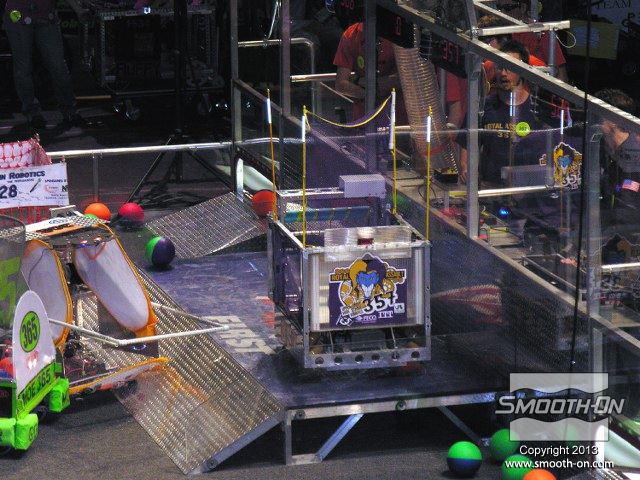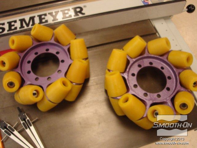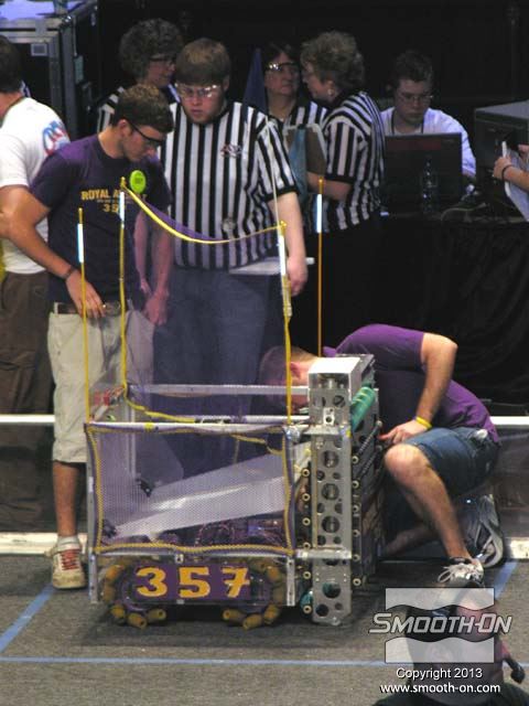 קבוצת הRoyal Assault Team 357 מפילדלפיה עם הרובוט המוכן שלהם. ניתן לראו את גלגלי הפוליאורתן בתחתית הרובוט. רולרים מפוליאוריתן יצוק מחוברים למבנה המרכזי של הגלגל. תבנית סיליקון Mold Max 30 משמשת ליציקת חלקי הפוליאורתן על ליבה טבעתית מניילון/מתכת. תבניות גומי סיליקון Mold Max 30, של מודלי שלד הגלגל המקוריים. הגלגלים הגמורים. התלמידים מכינים את הרובוט לקרב. הרובוטים נשלטים מרחוק ומתחרים כדי להגיע לבמת המנצחים. בדרך לבמת המנצחים התלמידים צריכים להתחרות ברובוטים של הקבוצות היריבות. זה משחק של הפוך (תהרוג) או שתהפך (תהרג). קבוצת Royal Assault 357 הופכת רובוט מתחרה ואז.... נלחמת כדי לבסס את עמדתה על במת המנצחים. למבנה הגלגל היחודי יש השלכות גם מעבר לעולם הרובוטיקה של הקבוצה. מספר תאגידים תעשייתים הביעו עניין במבנה הגלגל היחודי.