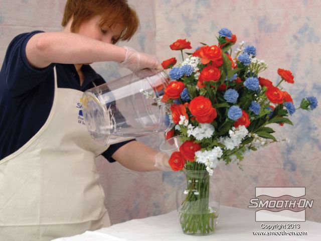 מסדרים פרחים מלאכותיים (פרחי משי) באגרטל מזכוכית. לפני תהליך הצרירה (אנקפסולציה) עם סיליקון שקוף כמו מים Encapso® K, מסדרים את כל החומרים והכלים הדרושים. מערבבים כמויות שוות של בסיס ומקשה של סיליקון שקוף ליציקה Encapso® K במיכל ערבוב גדול. מערבבים ביסודיות את הסיליקון Encapso® K תוך גירוד של צידי ותחתית המיכל מספר פעמים. שופכים את לאגרטל את ה סיליקון שקוף כמים Encapso® K דרך משפך. שופכים את ה סיליקון השקוף Encapso® K לאט ובזהירות עד לגובה הרצוי. בוחנים את סידור הפרחים וממקמים את הגבעולים מחדש במידת הצורך. בועות אוויר שנלכדו בסיליקון ישתחררו לאחר מספר דקות. זמן ההתמצקות של סיליקון שקוף ללכידה Encapso® K הוא 24 שעות.