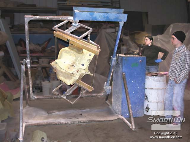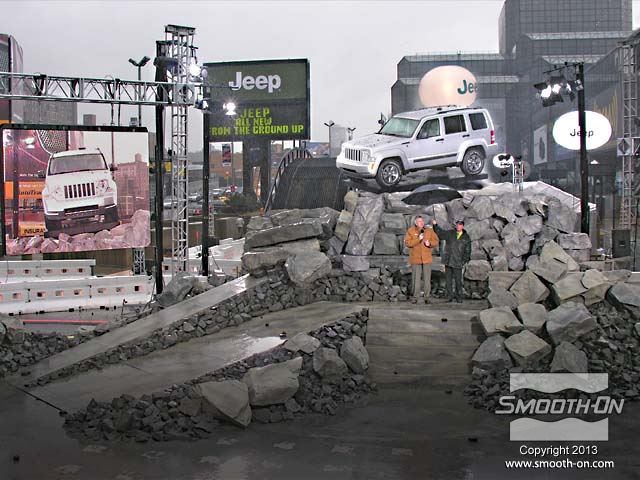 שופינג של סלעים.... ביל קלופינה בוחר את הסלעים שיהיו המודלים להעתקה. הסלעים הועברו מהמחצבה המקומית לרצפת הייצור של חברת Byond Design. חלק מהסלעים שקלו מעל ל-3 טון! הסלעים הוגבהו והוכנו לתהליך הכנת תבנית עם סיליקון להתזה Mold Max® 30. צינור המיקסר הסטטי מערבב את הבסיס והמקשה של סיליקון Mold Max® 30 היטב. קצב העבודה הגבוה של המכונה מאפשר כיסוי של מספר מודלים תוך כמה דקות. מסדרים את התבנית ביחד עם מעיל התמיכה במכונת יציקה ברוטציה (Rotocasting). צובעים מנה של פוליאוריטן ליציקה בסיבוב Smooth-Cast® 65D  בפיגמנט לפוליאוריטן SO-Strong שחור. מפעילים את המכונה ונותנים לה להסתובב במשך 15 דקות. חליצה - יציקות הפוליאוריטן Smooth-Cast® 65D  מוצאות מתבנית הסיליקון Mold Max וכעת מוכנות לצביעה. גימור - עבודת הצביעה והגימור נעשתה במהירות על ידי חברת Scenic Technologies. היציקות הגמורות נראות כאילו הן שוקלות טון, אך כל אחד יכול להרים אותן. לפוליאוריתן ליציקה ברוטציה Smooth-Cast® 65D עמידות גבוהה בפני פגיעה. אין חשש שהחומר ישבר אם יפול בזמן העברתו ממקום למקום, אם ידרכו עליו וכו'. חברת Chrysler השקיעה מאות אלפי דולרים בהכנת תצוגת הג'יפ והדובר של החברה שיבח את Beyond Design ואת Scenic Technologies ואמר ש