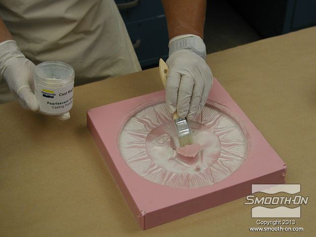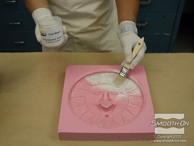 לחיצה להגדלת תמונה מורחים אבקת הCast Magic בצבע ירוק בהיר על משטח תבנית  Mold Max® 30 . מורחים אבקת הCast Magic בצבע ירוק בהיר על משטח תבנית Mold Max® 30 .