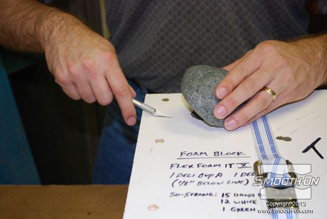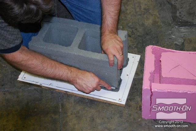 מכניסים את תבנית ה סיליקון ליציקה Mold Max 30 לתוך קופסת תבנית מעץ. בתוך תבנית הסיליקון קיימים מוטות תמיכה מעץ כך שהתבנית תשמור על צורתה בזמן היציקה. מכסה הקופסה מכיל חורים שיסייעו בשחרור הלחץ הנוצר בזמן התפשטות הקצף. מורחים על המכסה חומר הפרדה על בסיס וקס Sonite Wax, כדי למנוע מהקצף להדבק אליו. מורחים גם כל החורים במכסה חומר הפרדה על בסיס וקס Sonite Wax, כדי למנוע מהקצף להדבק. סוגרים את המכסה ומחזקים את הסגירה עם ראצ'טים. בשלב זה שמים כפפות ויניל כדי להגן על הידים. לפני שמודדים את חלק הבסיס של  ה פוליאוריתן גמיש מוקצף Flex Foam-iT! X מערבבים אותו היטב. לאחר הערבוב, מודדים את חלק הבסיס של ה פוליאוריתן מוקצף גמיש !Flex Foam-iT. מערבבים היטב גם את המקשה לפני שמודדים אותו. מודדים כמות שווה לפי נפח של המקשה. מוסיפים פיגמנט לפוליאוריתן So-Strong שחור למקשה של פוליאוריתן הFlex Foam-iT! X. מוסיפים גם פימנט So-Strong ירוק למקשה של פוליאוריטן מוקצף Flex Foam-iT! X . לבסוף, מוסיפים גם פיגמנט מרוכז לפוליאוריטן מסדרת So-Strong בצבע לבן למקשה של הפולאוריטן המוקצף Flex Foam-iT! X. מערבבים את המקשה עם הפיגמנטים השונים. שופכים את המקשה של קצף הFlex Foam-iT! X אל מיכל הערבוב. שופכים גם את הבסיס של קצף הFlex Foam-iT! X אל מיכל הערבוב. מערבבים בקפידה את שני המרכיבים. שופכים את תערובת ה פוליאוריטן מוקצף גמיש אל התבנית דרך החור במכסה. שופכים עוד מהקצף לחור בצד השני של המכסה. מניחים לקצף להתפשט אל מחוץ לקופסה ולהתמצק במשך שעה אחת. לאחר ההתמצקות חותכים את עודפי החומר שיצאו מחורי המכסה. מורידים את הראצ'טים. מורידים את מכסה קופסת התבנית. חותכים את שאריות החומר של תעלות כניסת החומר והאוורור שנשארו מהיציקה. היציקה מוכנה להוצאתה מהתבנית. הופכים את התבנית ומסירים את קופסת העץ מ תבנית הסיליקון. דוחפים את מוטות התמיכה מהעץ בעזרת מוט עץ נוסף. התבנית מוכנה לפתיחתה והוצאת היציקה. מקלפים את צידי התבנית מיציקת ה קצף פוליאוריתן. מוציאים את יציקת הפוליאוריטן הגמישה מתבנית הסיליקון. התקבלה יציקה מושלמת שדורשת מעט מאוד נקיונות. חותכים את הפלאשים הקיימים ביציקה בעזרת סכין חד. חותכים גם את הפלאשים בתחתית היציקה. מפזרים מעט טלק על פני היציקה כדי לתת לה מראה יותר אמיתי. היציקה מוכנה לשימוש. לבנים יצוקות אלו הן קלות מאוד ובטוחות לשימוש. לבנים אלו עמידות מאוד בזכות הגמישות והחוזק של פוליאוריתן מוקצף גמיש  הFlex Foam-iT! X. חוזרים על התהליך מספר פעמים לפי הצורך... ויוצרים קיר לבנים מדומות קל משקל!
